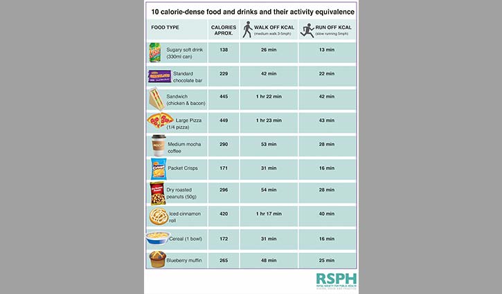 যুক্তরাজ্যের রয়াল সোসাইটি ফর পাবলিক হেলথ একটি তালিকা প্রকাশ করেছে, যেখানে উল্লেখ রয়েছে জনপ্রিয় কিছু জাঙ্ক ফুড থেকে গ্রহণ করা ক্যালোরি ঝরানোর জন্য ঠিক কতক্ষণ হাঁটাহাঁটি বা জগিং করা উচিত।
